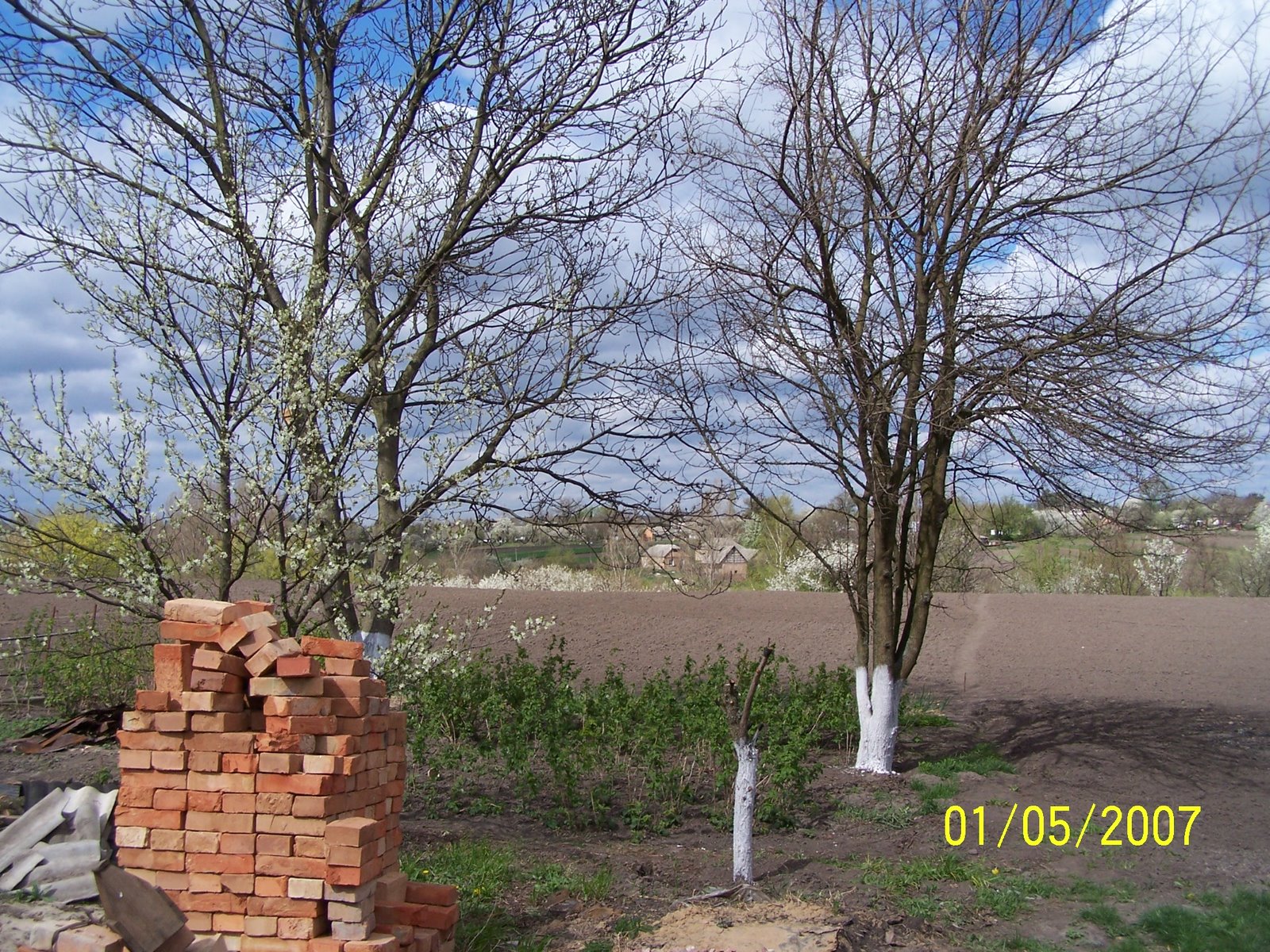 кирпичи для перекладывания веранды, огород еще не огорожен, малины маловастенько